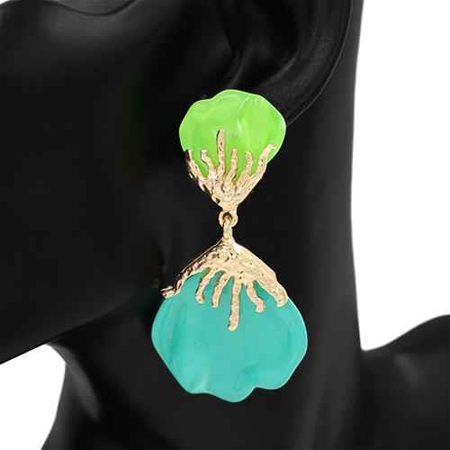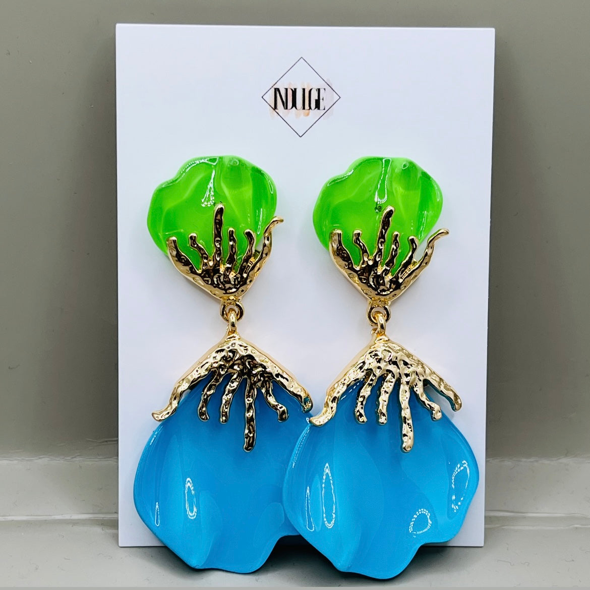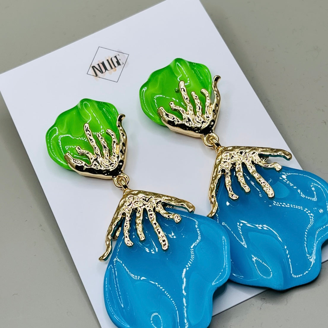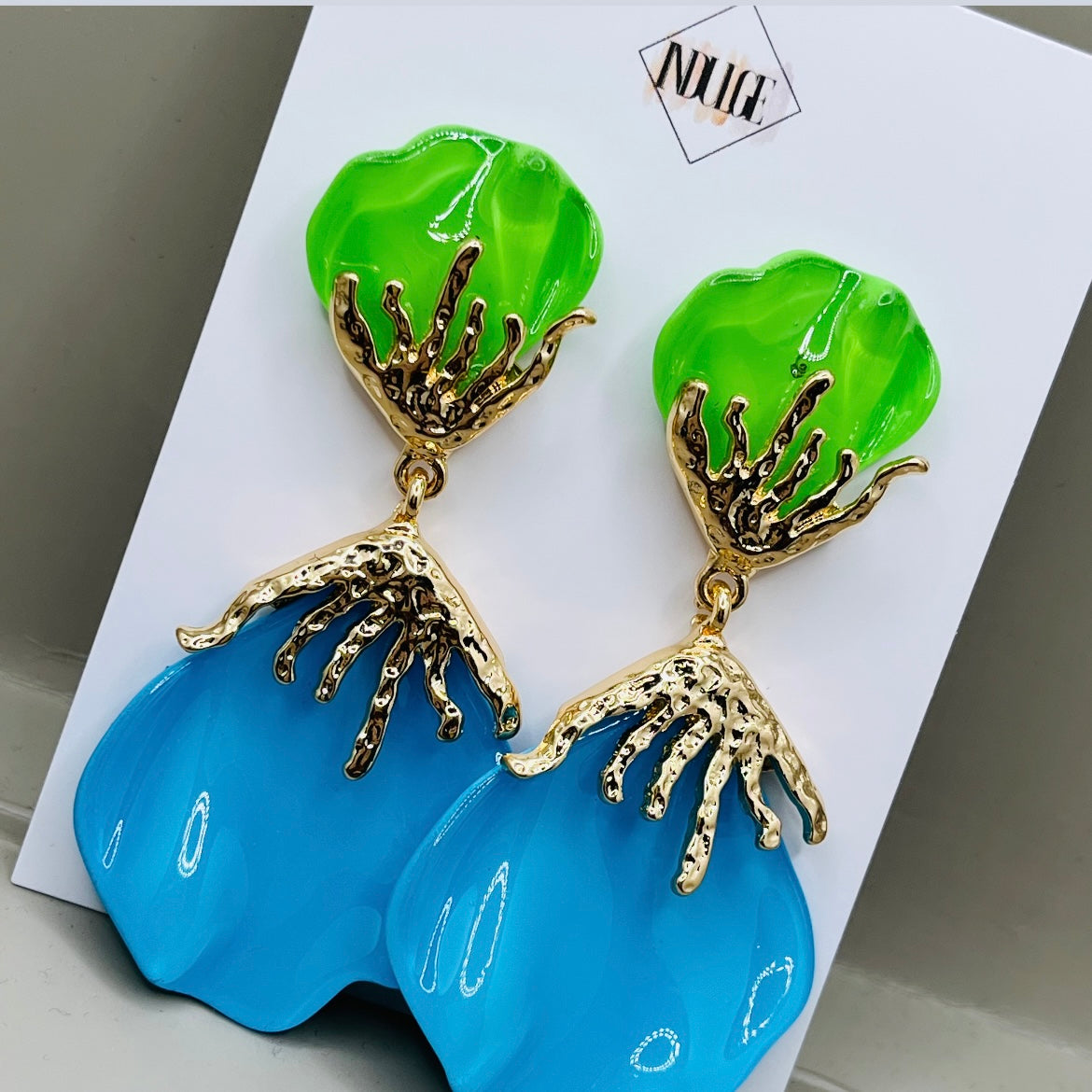 Bring bold, vibrant energy to your look with our Tropical Bloom Statement Earrings. Featuring striking lime green and ocean blue petals, these earrings are accented with textured gold-tone detailing that mimics organic coral-like shapes. Their oversized floral design captures the essence of summer—playful, daring, and full of life.