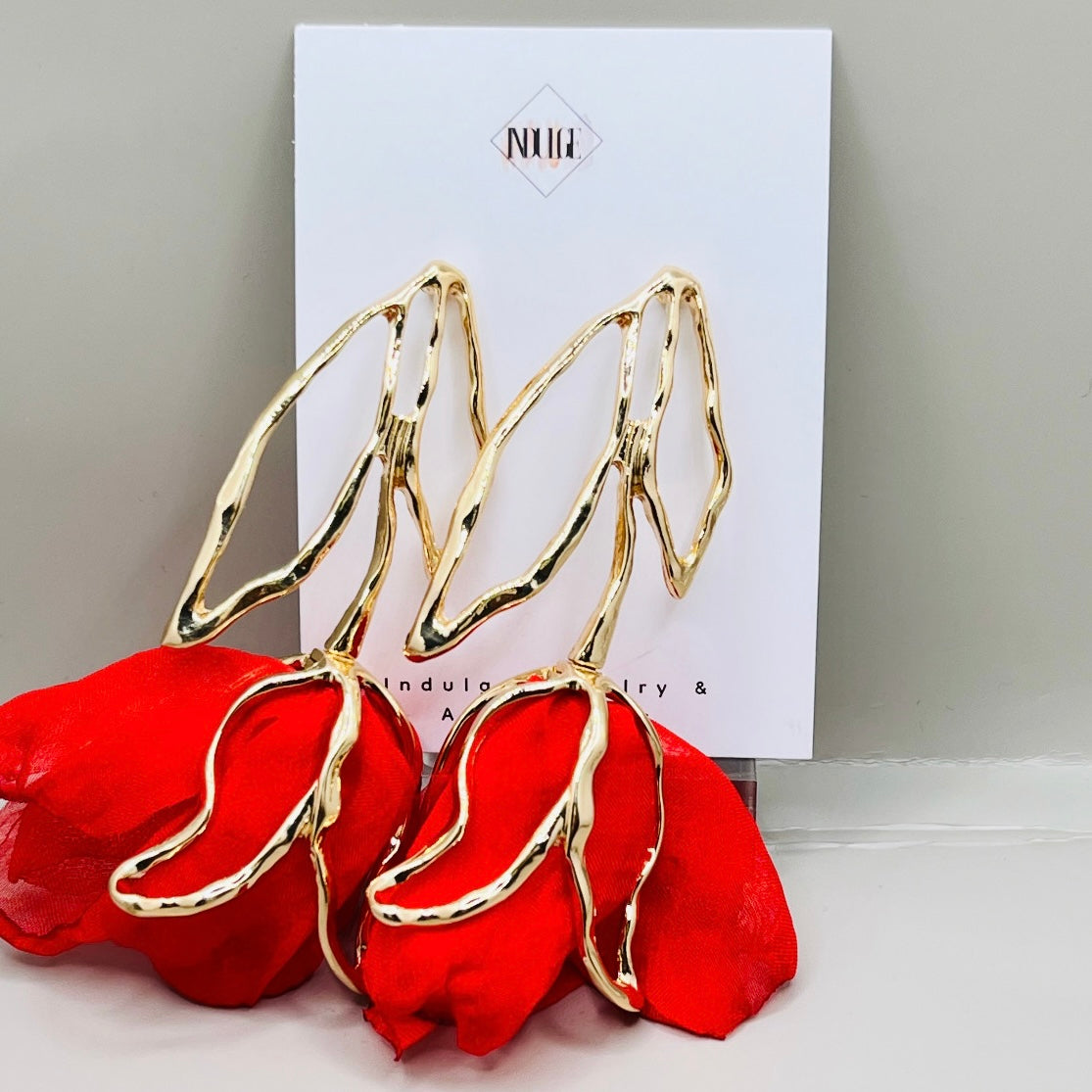 Make a statement with these eye-catching floral earrings that bring the drama in all the right ways. Featuring a radiant gold outline with a dimensional 3D effect, these earrings are finished with vibrant red faux petals for a striking pop of color.