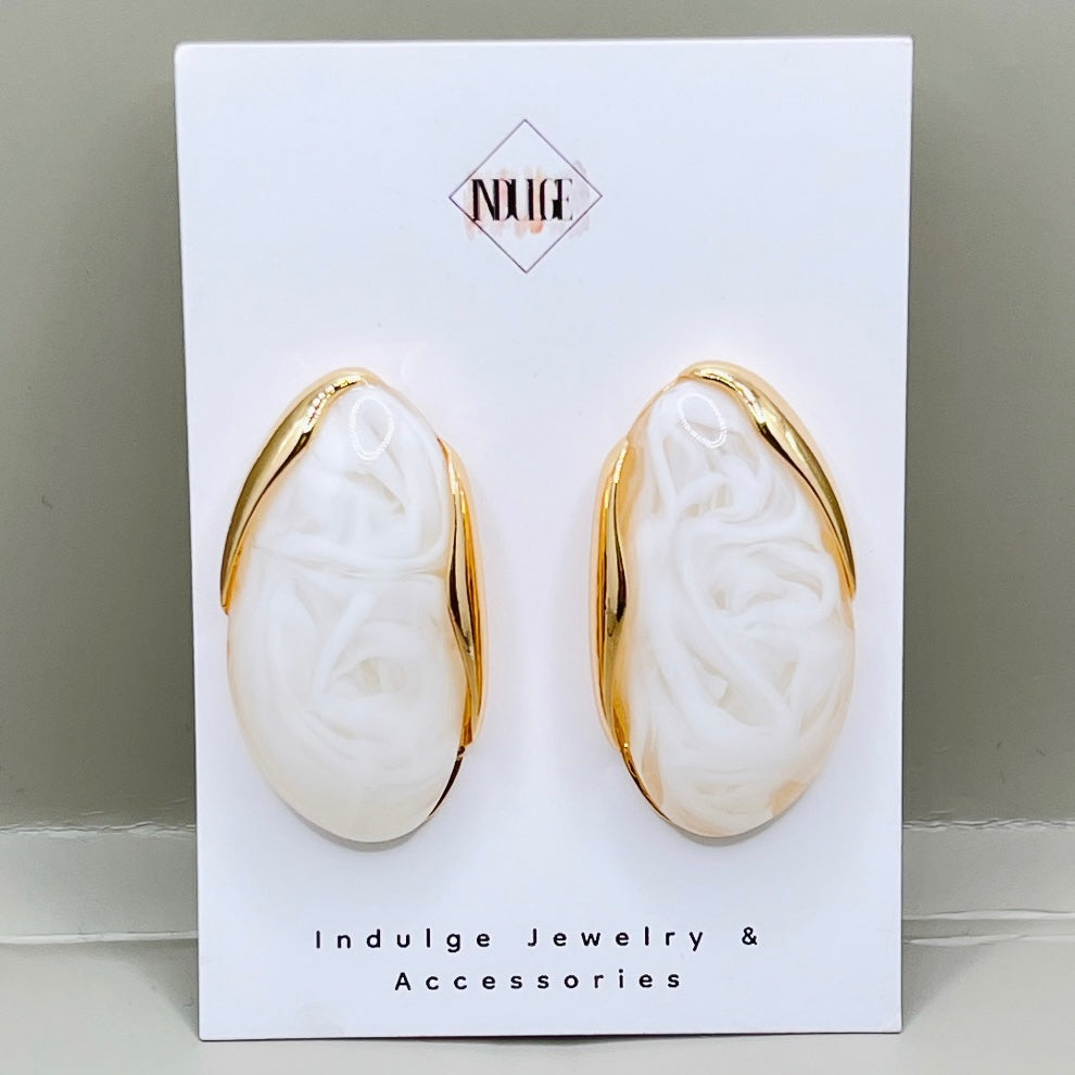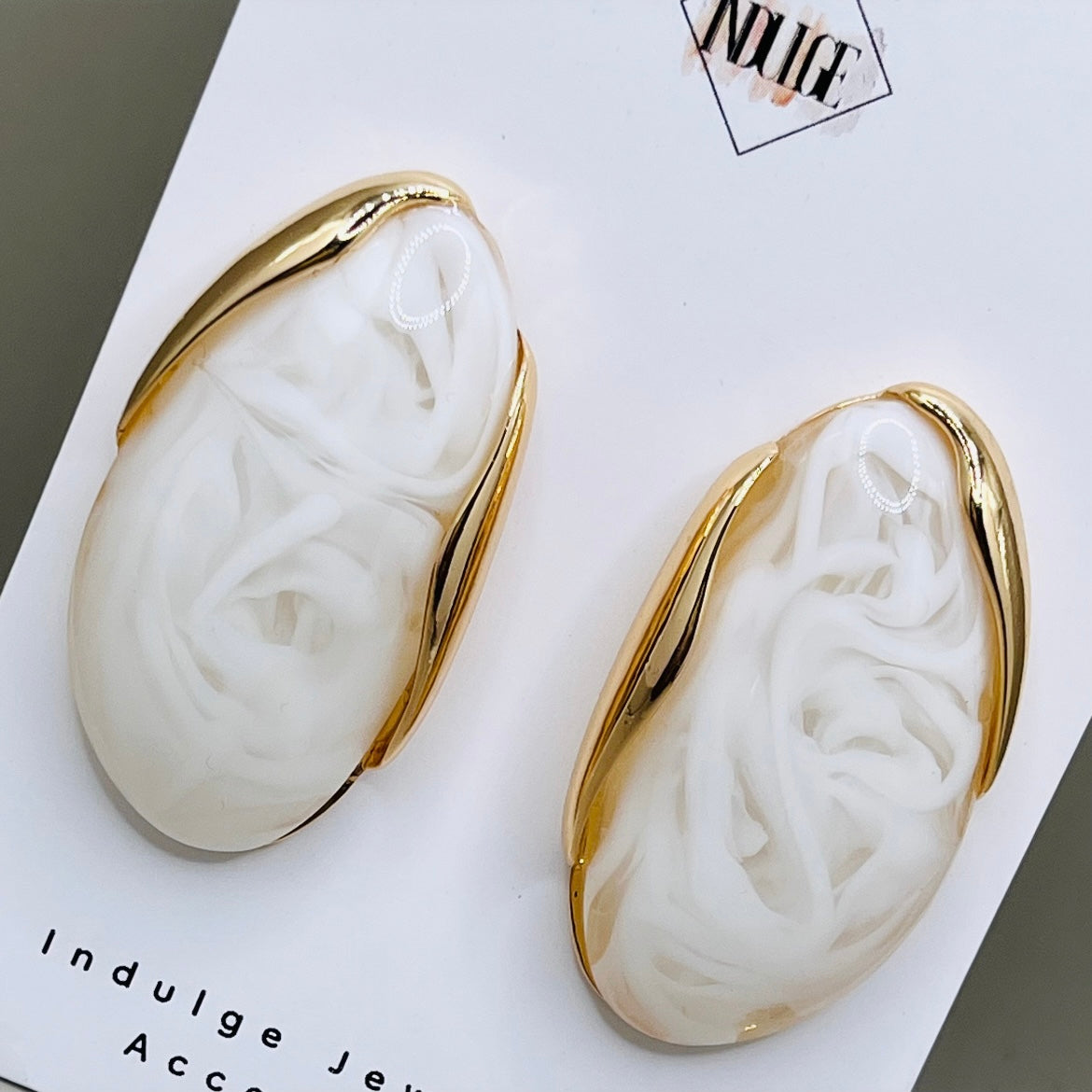 Understated elegance meets modern edge. These white marble-effect studs are detailed with sleek gold trimmings for a timeless touch. Designed with a lightweight feel and secure post back, they’re your new go-to for effortless, everyday chic.